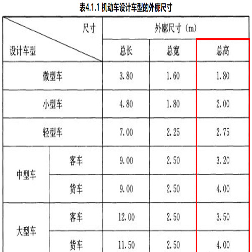 4.1.1 機動車庫應根據停放車輛的設計車型外廓尺寸進行設計。機動車設計車型的外廓尺寸可按表4.1.1取值。