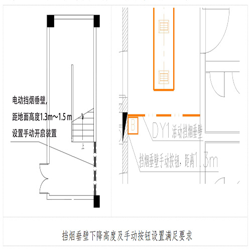 暖通專業(yè)設(shè)計圖紙未明確表達(dá)活動擋煙垂壁手動開啟裝置的具體安裝位置,施工未按設(shè)計圖紙位置安裝手動開啟裝置,從而造成以下問題: