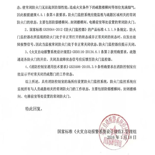 《火災自動報警系統設計規范》(GB50116-2013)4.6.1-2/疏散通道上各防火門的開啟、關閉及故障狀態信號應反饋至防火門監控器。